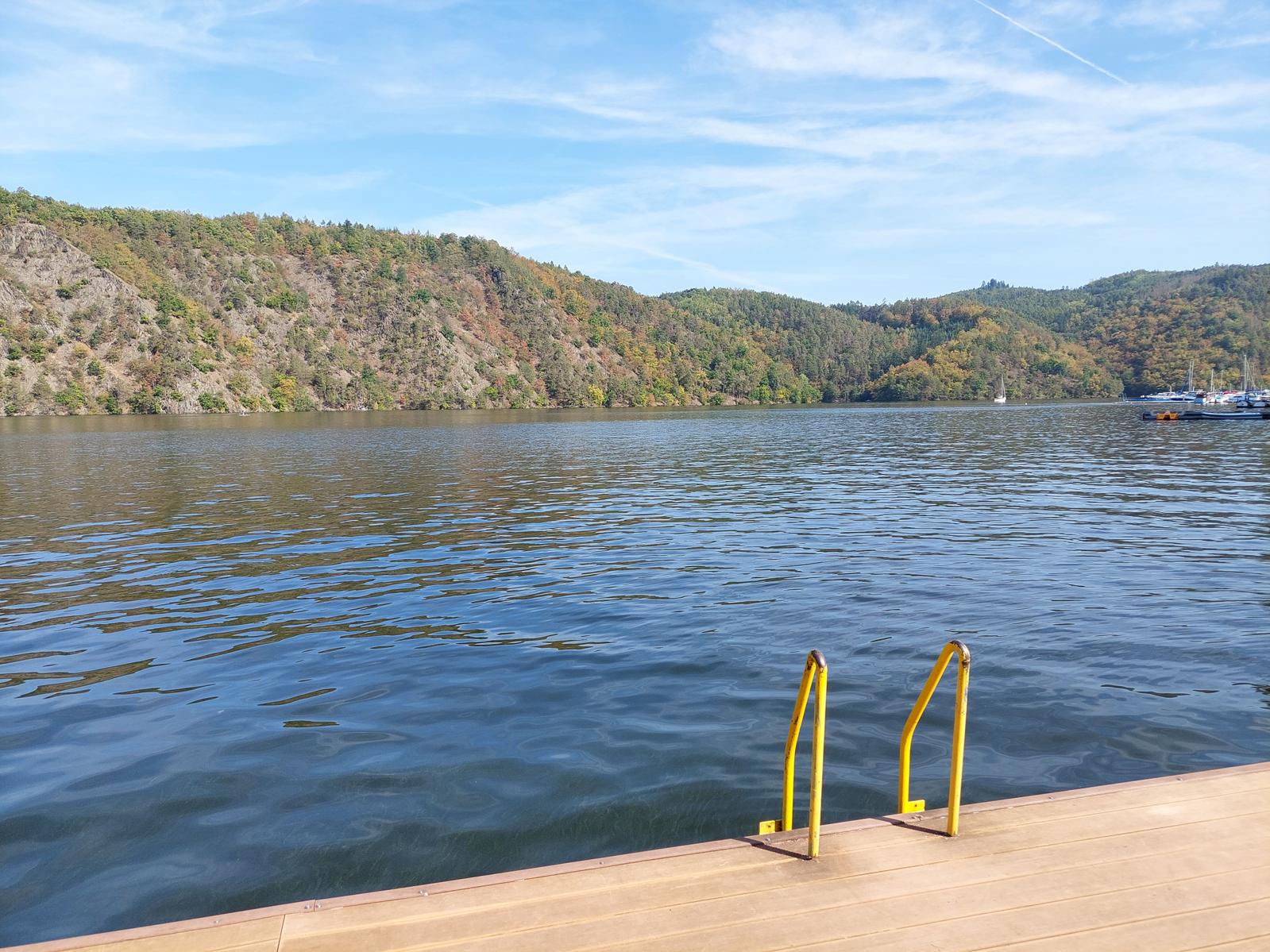 Vstup do vody je mořný z mola nebo ze břehu, který je pozvolný a písčitý. Velikost písčité pláže závisí na aktuální výšce hladiny vody. Běžně bývá písčitý břeh 2-3m bez vody, při plném napuštění přehrady dosahuje voda až k zalesněnému břehu. Hloubka vody u mola se pohybuje dle napuštění přehrady cca 2 - 3m.